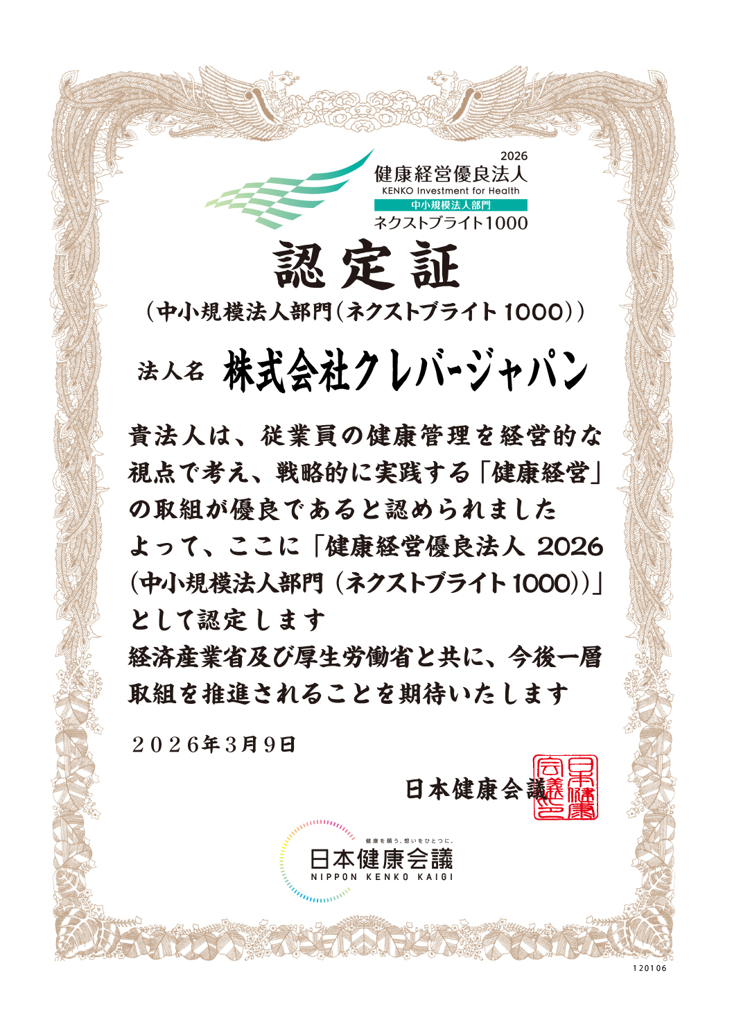 2026.04.01 お知らせ 「健康経営優良法人2026 中小企業部門 ネクストブライト1000」に認定を受けました 今年も経済産業省と日本健康会議が実施する健康経営優良法人認定制度において「健康経営優良法人2026 中小企業部門 ネクストブライト1000」に認定を受けることができました。これからも引き続き、心身共に健康で安心して働くことが出来る環境づくりに努めて参ります。 記事一覧に戻る